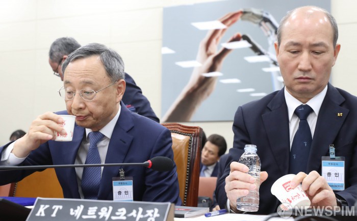 [서울=뉴스핌] 김학선 기자 = 황창규 KT 회장이 17일 국회에서 열린 KT 화재원인 규명 및 방지대책에 대한 청문회에 증인으로 출석해 목을 축이고 있다. 오른쪽은 오성목 KT 네트워크부문장(사장). 2019.04.17 yooksa@newspim.com
