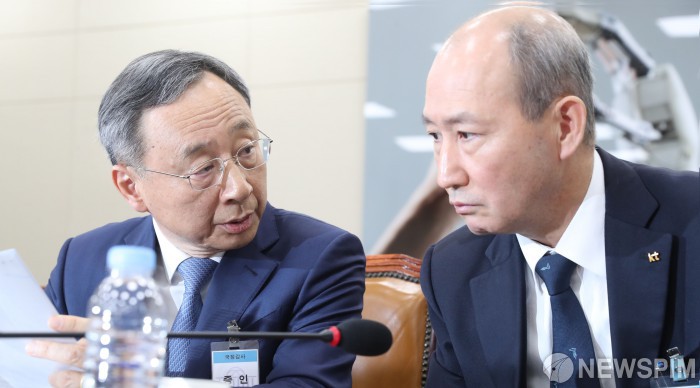 [서울=뉴스핌] 김학선 기자 = 황창규 KT 회장과 오성목 네트워크부문장(사장)이 17일 국회에서 열린 KT 화재원인 규명 및 방지대책에 대한 청문회에 증인으로 출석해 논의하고 있다. 2019.04.17 yooksa@newspim.com