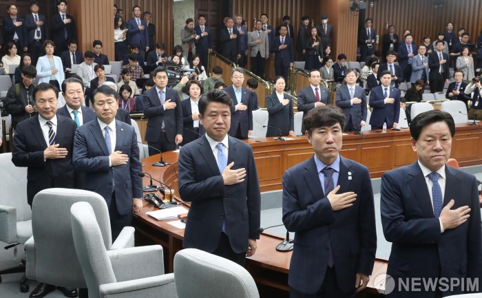 [서울=뉴스핌] 김학선 기자 = 손학규 바른미래당 대표와 김관영 원내대표 등 의원들이 18일 국회에서 열린 의원총회에서 국민의례를 하고 있다. 바른미래당은 이날 선거법 개정안을 패스트트랙(신속처리안건)으로 추진할지를 두고 끝장 의원총회를 진행한다. 2019.04.18 yooksa@newspim.com