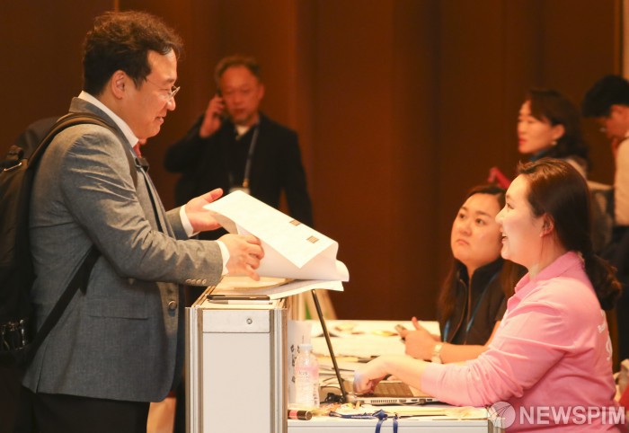 [서울=뉴스핌] 이한결 인턴기자 = 23일 오전 서울 중구 롯데호텔 서울에서 ‘KBIZ 2019 해외유력바이어 초청 수출상담회’가 열려 참가자들이 컨트롤데스크에서 현장 매칭 안내를 받고 있다. 이번 수출상담회는 중소기업중앙회 주관으로 23일과 24일 이틀간 진행된다. 2019.04.23