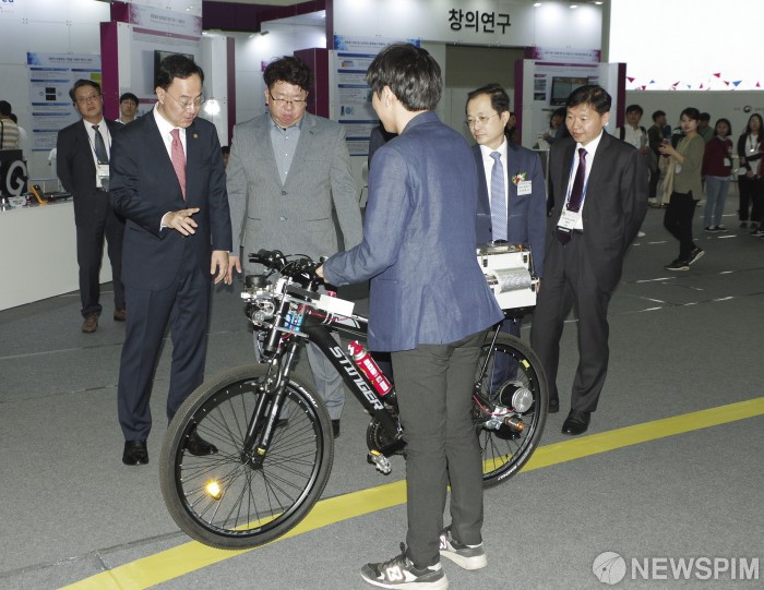 [서울=뉴스핌] 백인혁 인턴기자 = 민원기 과학기술정보통신부 제 2차관이 24일 오후 서울 강남구 코엑스에서 열린 2019 ICT 미래인재포럼 개회식에 참석하기 전 관계자에게 자율주행자전거의 설명을 듣고있다. 2019.04.24 dlsgur9757@newspim.com