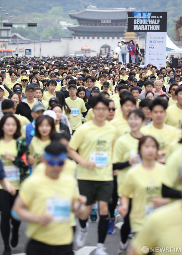[서울=뉴스핌] 윤창빈 기자 = 28일 오전 서울 종로구 광화문광장에서 열린 ‘2019 서울 하프마라톤’에서 참가자들이 출발을 하고 있다. 2019.04.28 pangbin@newspim.com