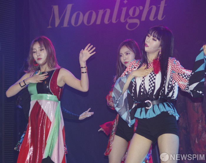 [서울=뉴스핌] 백인혁 인턴기자 = 걸그룹 지구(Geegu)가 29일 오전 서울 마포구 롤링홀에서 열린 컴백 쇼케이스에서 타이틀곡 'Moonlight'의 무대를 선보이고 있다. 2019.04.29 dlsgur9757@newspim.com