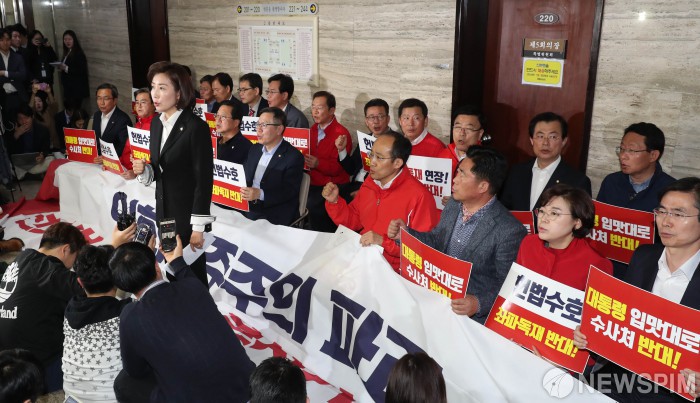 [서울=뉴스핌] 김학선 기자 = 나경원 원내대표와 자유한국당 의원들이 29일 점거 농성중인 국회 사개특위 회의장 앞에서 정부와 여당을 규탄하며 구호를 외치고 있다. 2019.04.29 yooksa@newspim.com
