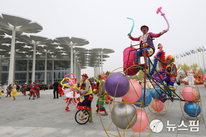 | [베이징 로이터=뉴스핌] 민지현 기자 = 중국 베이징 근교 옌칭(延慶)에서 열린 2019 세계원예박람회(베이징 엑스포) 개막식에서 광대로 분장한 곡예사들이 보인다. 2019.04.29. |