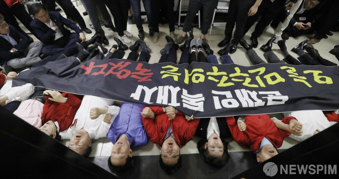 [서울=뉴스핌] 김학선 기자 = 자유한국당 나경원 원내대표와 의원들이 29일 밤 서울 여의도 국회 본청에서 열린 국회 사법개혁특별위원회(사개특위) 전체회의에서 검경수사권과 공수처 설치법의 패스트트랙이 통과되자 회의장 앞에 누워 항의를 하고 있다. 2019.04.29 yooksa@newspim.com