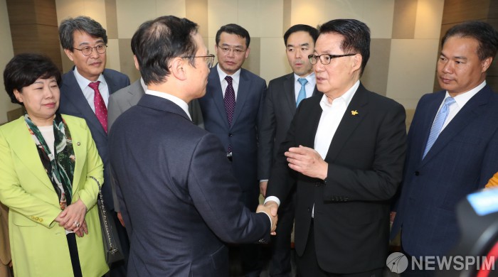 [서울=뉴스핌] 김학선 기자 = 29일 저녁 국회 예산결산특별위원회 회의장에서 더불어민주당 홍영표 원내대표, 민주평화당 박지원 의원, 새로 사개특위 위원이 된 바른미래당 임재훈, 채이배 의원 등이 함께 모여 있다. 2019.04.29 yooksa@newspim.com