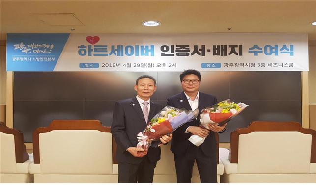 | 김양태, 이재명 주무관이 광주광역시 소방안전본부로부터 하트세이버(Heart Saver) 인증서를 받고 기념촬영을 하고 있다. [사진=광주우편집중국] |