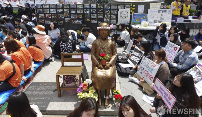 [서울=뉴스핌] 백인혁 인턴기자 = 8일 오후 서울 종로구 옛 일본대사관 앞에서 열린 제 1386차 일본군 위안부 문제해결을 위한 정기 수요집회가 열리고 있다. 2019.05.08 dlsgur9757@newspim.com