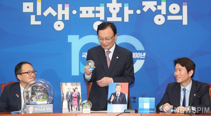 [서울=뉴스핌] 김학선 기자 = 이해찬 더불어민주당 대표가 9일 국회에서 열린 '문재인 정부 출범 2주년 기념 굿즈 런칭 행사'에 참석, 기념품을 소개하고 있다. 이번에 소개된 기념품은 오는 13일 더불어민주당 홈페이지에서 구매할수 있다. 2019.05.09 yooksa@newspim.com