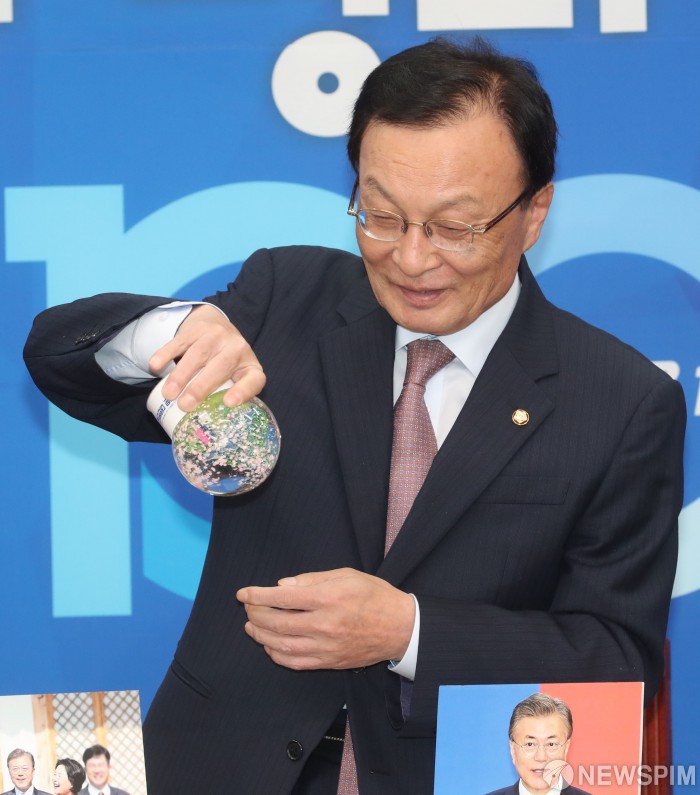 [서울=뉴스핌] 김학선 기자 = 이해찬 더불어민주당 대표가 9일 국회에서 열린 '문재인 정부 출범 2주년 기념 굿즈 런칭 행사'에 참석, 기념품을 소개하고 있다. 이번에 소개된 기념품은 오는 13일 더불어민주당 홈페이지에서 구매할수 있다. 2019.05.09 yooksa@newspim.com