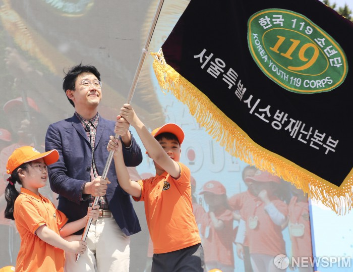 [서울=뉴스핌] 이한결 인턴기자 = 9일 오전 서울 여의도공원에서 열린 ‘2019년 서울안전한마당’ 개막식에서 한국119소년단 어린이들과 담당 선생님이 단기를 흔들고 있다. 2019.05.09 alwaysame@newspim.com