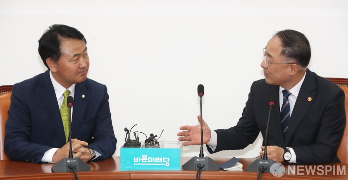 [서울=뉴스핌] 김학선 기자 = 홍남기 부총리 겸 기획재정부 장관이 9일 국회에서 추경안 통과 협조와 관련해 김관영 바른미래당 원내대표를 예방, 대화를 나누고 있다. 2019.05.09 yooksa@newspim.com
