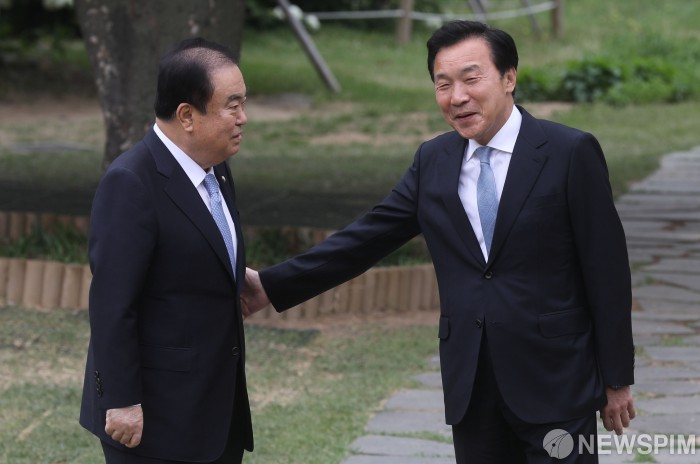 [서울=뉴스핌] 최상수 기자 = 문희상 국회의장, 손학규 바른미래당 대표가 13일 오후 서울 여의도 국회 사랑재에서 열린 초월회 오찬 간담회에서 대화를 나누고 있다. 2019.05.13 kilroy023@newspim.com