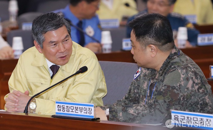 [서울=뉴스핌] 윤창빈 기자 = 정경두 국방부 장관(왼쪽부터), 박한기 합동참모본부 의장이 14일 오후 서울 종로구 정부서울청사 별관에서 열린 을지태극연습 준비보고회의에서 대화를 나누고 있다. 2019.05.14 pangbin@newspim.com