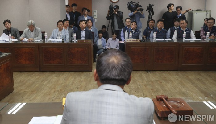 [서울=뉴스핌] 이한결 인턴기자 = 사측인 피정권 서울시 버스운송사업조합 이사장과 노조측 서정수 서울시버스노동조합 위원장이 14일 오후 서울 영등포구 서울지방노동위원회에서 열린 2차 노동쟁의조정회의에 참석해 굳은 표정으로 앉아있다. 2019.05.14 alwaysame@newspim.com