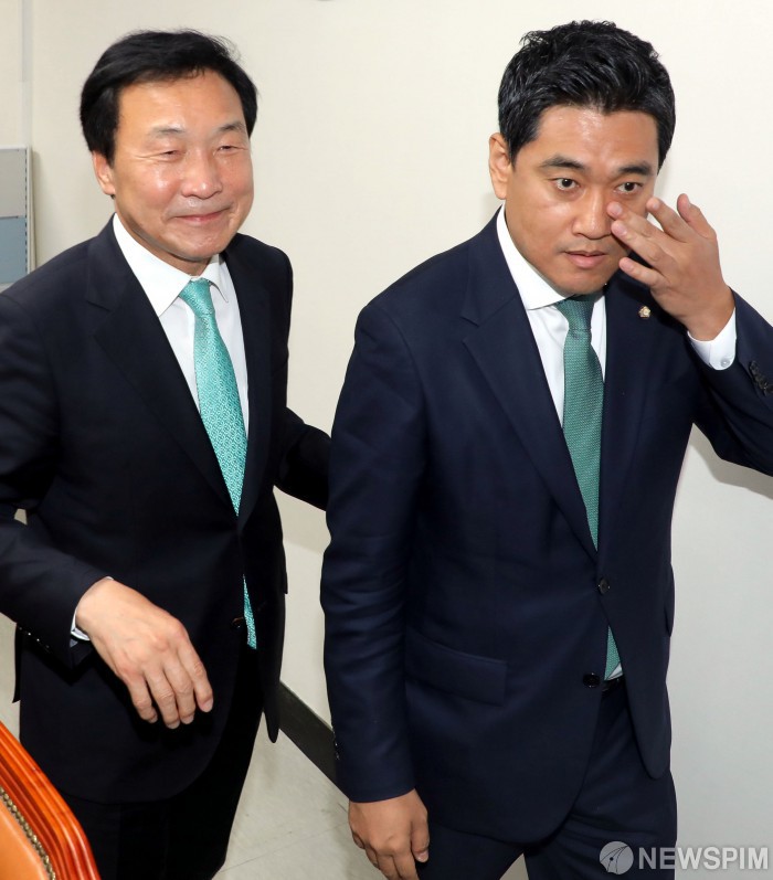 [서울=뉴스핌] 최상수 기자 = 손학규 바른미래당 대표(왼쪽)와 오신환 원내대표(오른쪽)가 16일 오후 여의도 국회에서 비공개 만남을 위해 회의실로 이동하고 있다. 2019.05.16 kilroy023@newspim.com