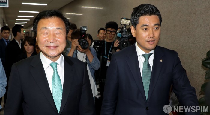 [서울=뉴스핌] 최상수 기자 = 손학규 바른미래당 대표(왼쪽)와 오신환 원내대표(오른쪽)가 16일 오후 여의도 국회에서 비공개 만남을 위해 회의실로 이동하고 있다. 2019.05.16 kilroy023@newspim.com