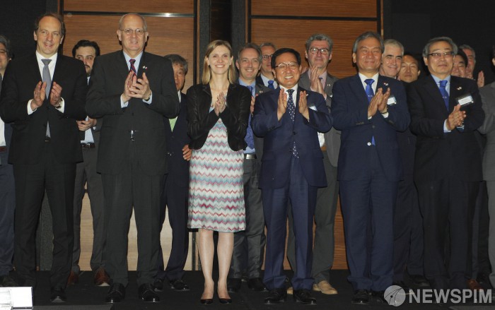 [서울=뉴스핌] 백인혁 인턴기자 = 17일 오전 서울 영등포구 콘래드호텔에서 열린 제 3차 한-불 우주포럼, 양자회담에서 유영민 과학기술정보통신부 장관과 쟝 이브 르 갈 프랑스 국립우주센터 원장, 아네스 파니에 뤼나쉐 프랑스 재정경제부 국무장관, 임현철 한국항공우주연구원 원장을 비롯한 참석자들이 기념촬영을 하고 있다. 2019.05.17 dlsgur9757@newspim.com