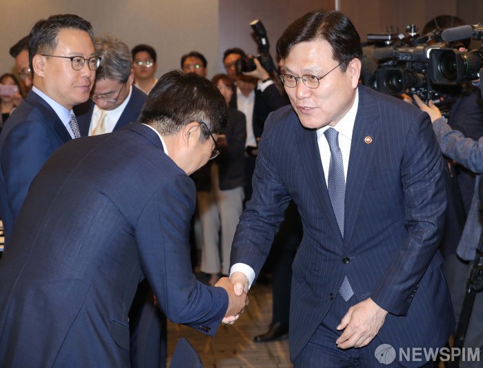[서울=뉴스핌] 윤창빈 기자 = 최종구 금융위원회 위원장이 22일 오전 서울 중구 은행회관에서 열린 청년 맞춤형 전·월세대출 협약식에서 참석자들과 인사를 나누고 있다. 2019.05.22 pangbin@newspim.com