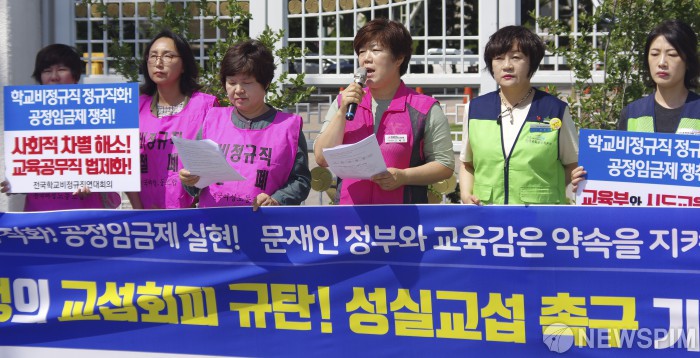 [서울=뉴스핌] 백인혁 인턴기자 = 박금자 전국학교비정규직노조 위원장이 22일 오전 서울 종로구 정부서울청사 앞에서 열린 교육부,교육청의 교섭회피규탄 및 성실교섭 촉구 기자회견에서 발언하고 있다. 2019.05.22 dlsgur9757@newspim.com