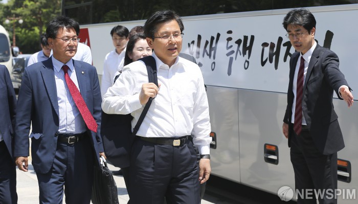 [서울=뉴스핌] 이형석 기자 = 황교안 자유한국당 대표가 22일 오후 서울 여의도 국회에서 ‘민생투쟁 버스 대장정‘ 차량에 탑승하고 있다. 2019.05.22 leehs@newspim.com