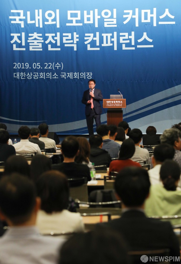 [서울=뉴스핌] 윤창빈 기자 = 김진수 중앙대학교 경영학부 교수 겸 서울창조혁신센터 이사장이 22일 오후 서울 중구 대한상공회의소에서 열린 국내외 모바일 커머스 진출전략 컨퍼런스에서 기조연설을 하고 있다. 2019.05.22 pangbin@newspim.com