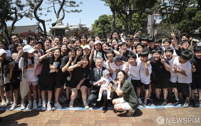 [서울=뉴스핌] 문재인 대통령이 22일 충북 청주중앙공원을 찾아 역사유적지를 둘러본 후 시민들과 기념 촬영을 하고 있다. 2019.5.22 [사진=청와대] 2019.5.22