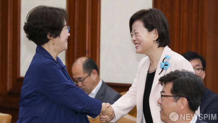 [서울=뉴스핌] 최상수 기자 = 진선미 여성가족부 장관(오른쪽),엄규숙 청와대 여성가족비서관(왼쪽)이 23일 오전 서울 종로구 정부서울청사에서 열린 국정현안점검조정회의에서 악수를 나누고 있다. 2019.05.23 kilroy023@newspim.com