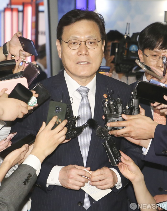 [서울=뉴스핌] 이한결 인턴기자 = 최종구 금융위원회 위원장이 23일 오전 서울 중구 동대문디자인플라자(DDP)에서 열린 ‘코리아 핀테크 위크 2019’ 방문을 마친 후 백룸에서 취재진의 질문에 답변하고 있다. 2019.05.23 alwaysame@newspim.com