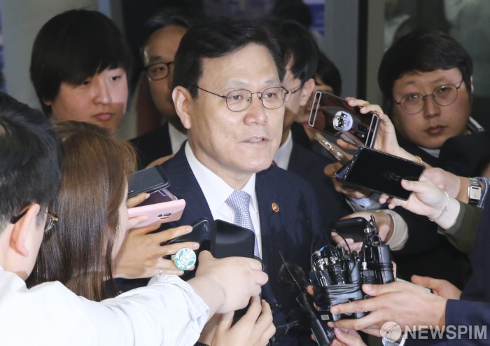 [서울=뉴스핌] 이한결 인턴기자 = 최종구 금융위원회 위원장이 23일 오전 서울 중구 동대문디자인플라자(DDP)에서 열린 ‘코리아 핀테크 위크 2019’ 방문을 마친 후 백룸에서 취재진의 질문에 답변하고 있다. 2019.05.23 alwaysame@newspim.com