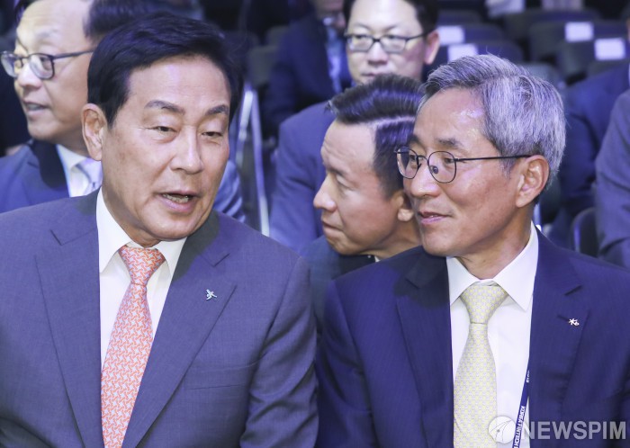 [서울=뉴스핌] 이한결 인턴기자 = 김정태 KEB하나금융지주 회장(왼쪽)과 윤종규 KB금융지주 회장이 23일 오전 서울 중구 동대문디자인플라자(DDP)에서 열린 ‘코리아 핀테크 위크 2019’ 개막식에서 대화를 나누고 있다. 2019.05.23 alwaysame@newspim.com