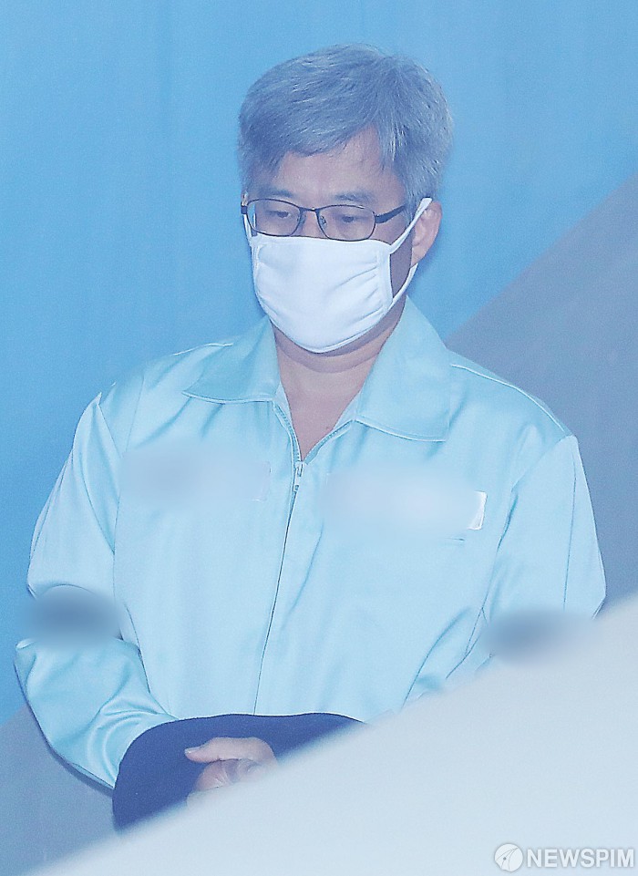[서울=뉴스핌] 윤창빈 기자 = 아내 폭행ㆍ강간 혐의을 받는 ‘드루킹’ 김동원씨가 24일 오전 서울 서초구 서울고등법원에서 열린 선고 공판에 출석하고 있다. 2019.05.24 pangbin@newspim.com