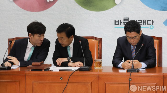 [서울=뉴스핌] 최상수 기자 = 손학규 바른미래당 대표(가운데), 하태경 최고위원(왼쪽)이 24일 오전 서울 여의도 국회에서 열린 임시 최고위원회의에서 대화를 나누고 있다. 2019.05.24 kilroy023@newspim.com