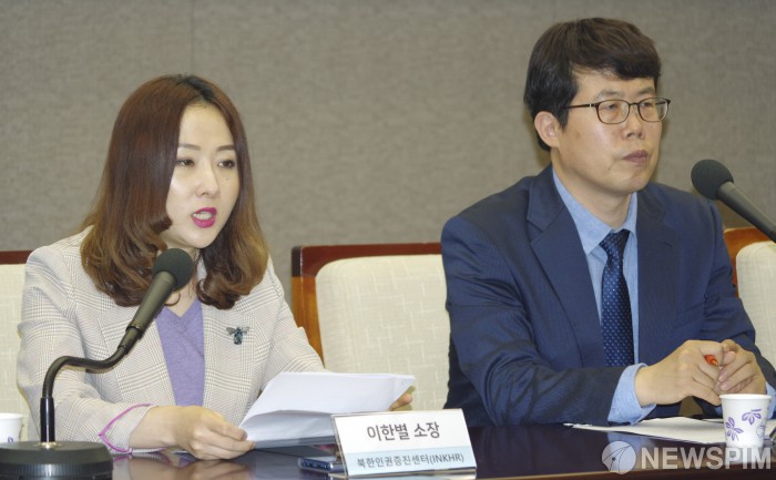 [서울=뉴스핌] 백인혁 인턴기자 = 이한별 북한인권증진센터 소장(왼쪽)이 29일 오전 서울 중구 프레스센터에서 열린 문재인 정부, 북한인권 정책 전환 촉구 기자회견에서 발언하고 있다. 2019.05.29 dlsgur9757@newspim.com