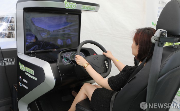 [서울=뉴스핌] 최상수 기자 = 4일 오후 서울 강남구 코엑스에서 열린 교통문화발전대회 시민체험존에서 한 시민이 에코드라이브 가상 체험을 하고 있다. 2019.06.04 kilroy023@newspim.com