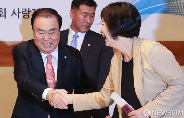 [서울=뉴스핌] 최상수 기자 = 문희상 국회의장-이정미 정의당 대표가 10일 오후 서울 여의도 국회 사랑재에서 열린 초월회 오찬 간담회에서 악수를 나누고 있다. 2019.06.10 kilroy023@newspim.com
