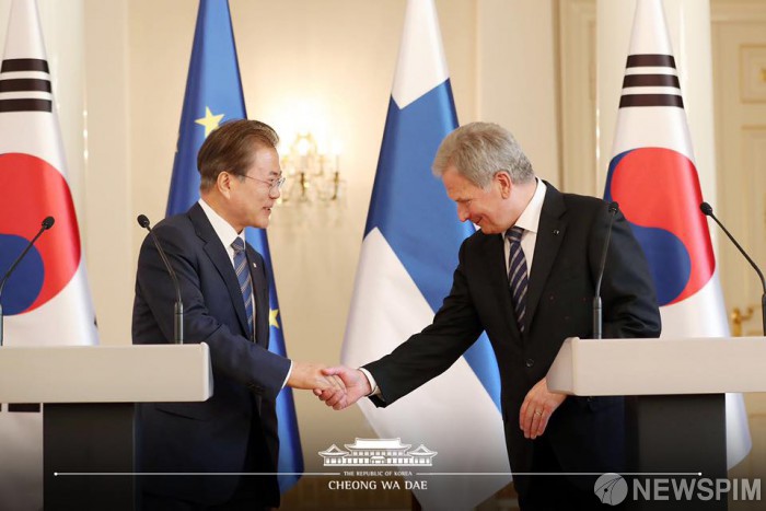 [서울=뉴스핌] 문재인 대통령이 10일 오전(현지시간) 핀란드 대통령궁에서 열린 공동기자회견에서 사울리 니니스퇴 대통령과 악수하고 있다.[사진=청와대페이스북] 2019.6.10