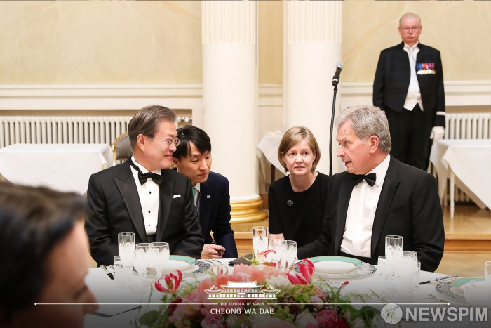 [서울=뉴스핌] 문재인 대통령이 10일(현지시간) 오후 헬싱키 대통령궁에서 열린 국빈만찬에서 사울리 니니스퇴 대통령과 대화하고 있다. [사진=청와대페이스북] 2019.6.11
