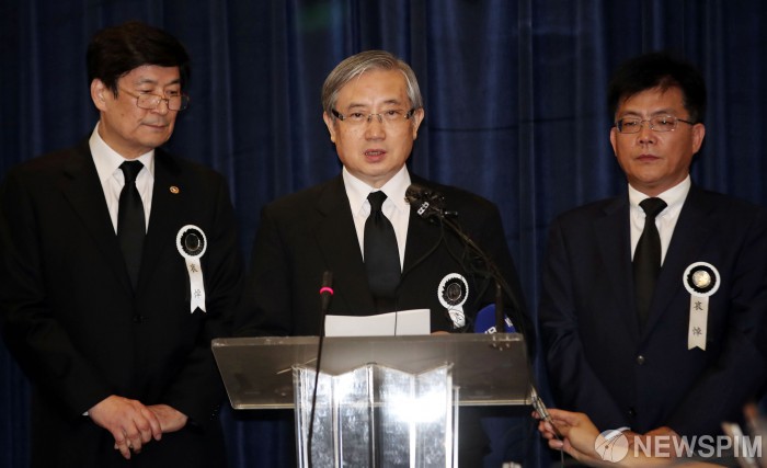 [서울=뉴스핌] 정일구 기자 = 고(故) 이희호 여사 장례위원회 집행위원장을 맡은 김성재 김대중평화센터 상임이사가 11일 오전 서울 서대문구 세브란스병원에서 기자회견을 열고 고인의 유언과 장례 계획에 대해 설명하고 있다. 2019.06.11 mironj19@newspim.com