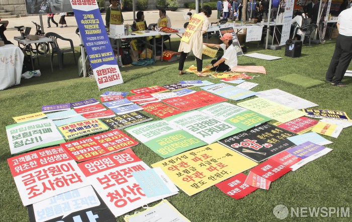 [서울=뉴스핌] 이한결 기자 = 11일 오후 서울 중구 시청 앞 서울광장에서 열린 ‘재벌체제개혁을 위한 을들의 만민공동회’의 박람회에서 각종 참가단체의 피켓이 잔디밭에 놓여있다. 2019.06.11 alwaysame@newspim.com