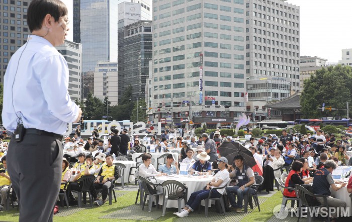 [서울=뉴스핌] 이한결 기자 = 박상인 서울대 교수(경실련 정책위원장)가 11일 오후 서울 중구 시청 앞 서울광장에서 열린 ‘재벌체제개혁을 위한 을들의 만민공동회’에서 기조 발언을 하고 있다. 2019.06.11 alwaysame@newspim.com