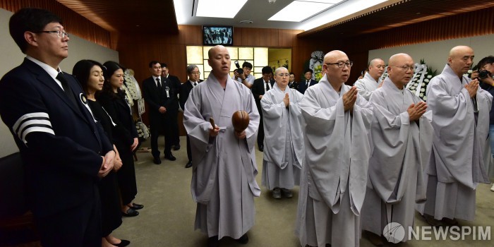 [서울=뉴스핌] 정일구 기자 = 조계종 조문단이 12일 오후 서울 서대문구 신촌세브란스병원 장례식장에 마련된 김대중 전 대통령 부인 고(故) 이희호 여사의 빈소에서 조문을 하고 있다. 2019.06.12 mironj19@newspim.com