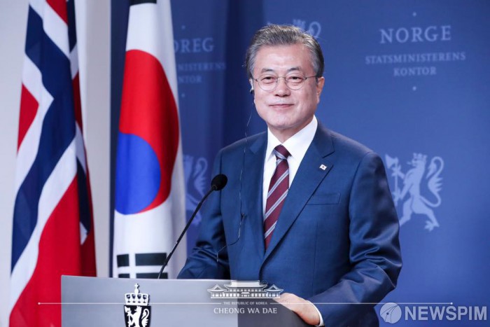 [서울= 뉴스핌] 문재인 대통령이 13일 오전(현지시간) 오슬로 총리관저에서 에르나 솔베르그 총리와 공동기자회견을 하고 있다. [사진=청와대페이스북] 2019.6.14