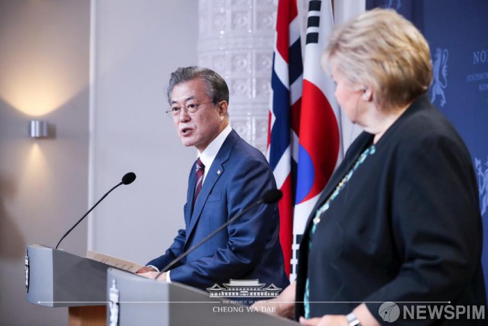 [서울= 뉴스핌] 문재인 대통령이 13일 오전(현지시간) 오슬로 총리관저에서 에르나 솔베르그 총리와 공동기자회견을 하고 있다. [사진=청와대페이스북] 2019.6.14