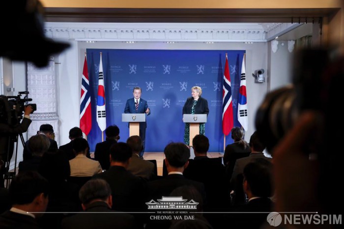 [서울= 뉴스핌] 문재인 대통령이 13일 오전(현지시간) 오슬로 총리관저에서 에르나 솔베르그 총리와 공동기자회견을 하고 있다. [사진=청와대페이스북] 2019.6.14