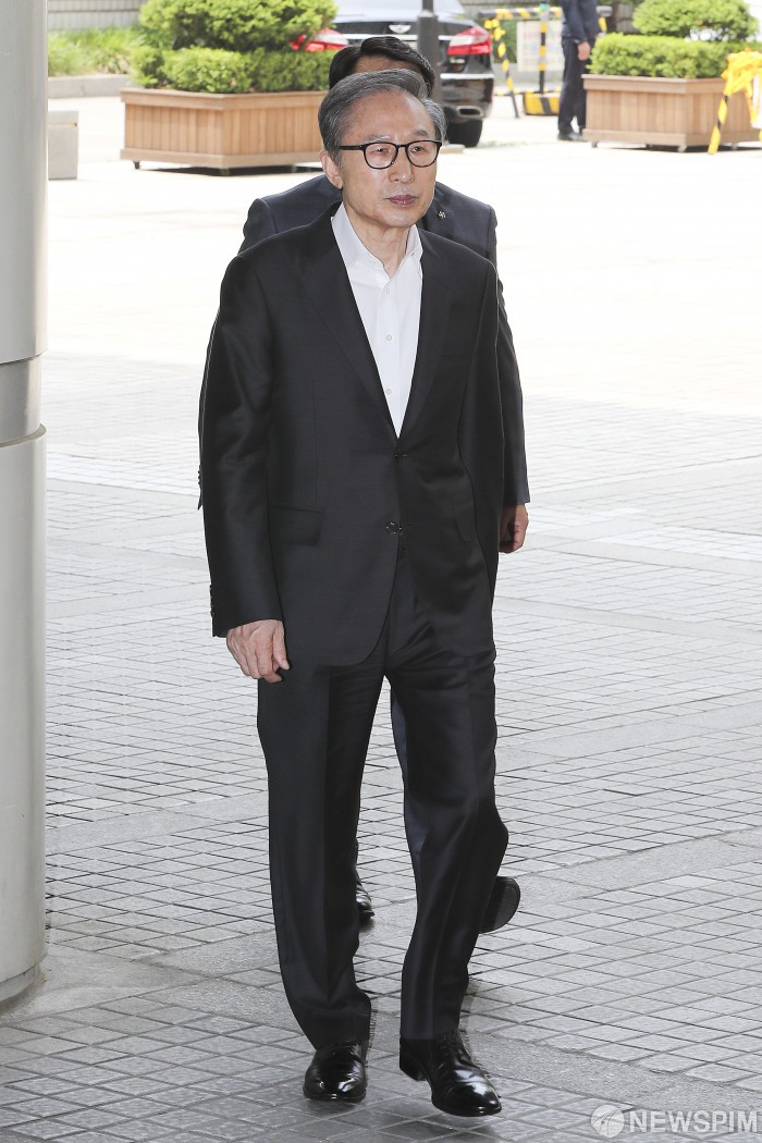 [서울=뉴스핌] 이형석 기자 = 다스 자금 횡령과 뇌물수수 의혹을 받는 이명박 전 대통령이 14일 오후 서울 서초구 서울고등법원에서 열린 항소심 공판에 출석하고 있다. 2019.06.14 leehs@newspim.com