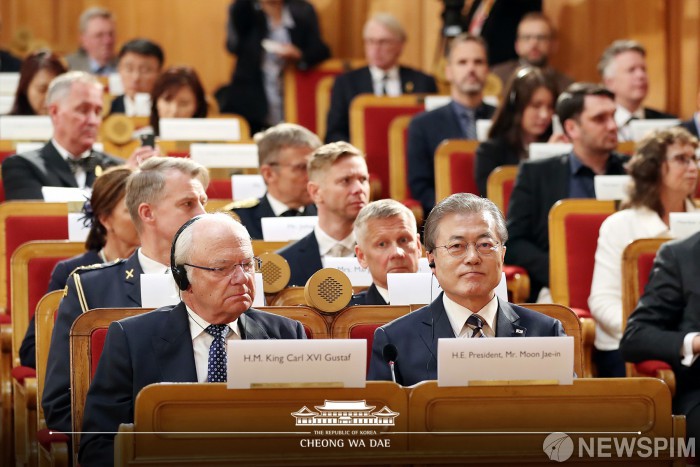 [서울= 뉴스핌] 문재인 대통령이 14일 오전(현지시간) 스웨덴 스톡홀름 시내에 있는 의회 제2의사당을 방문 연설하기위해 입장해 있다. [사진=청와대페이스북] 2019.6.14