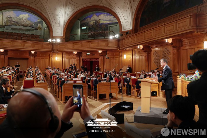 [서울= 뉴스핌] 문재인 대통령이 14일 오전(현지시간) 스웨덴 스톡홀름 시내에 있는 의회 제2의사당에서 연설하고 있다. [사진=청와대페이스북] 2019.6.14