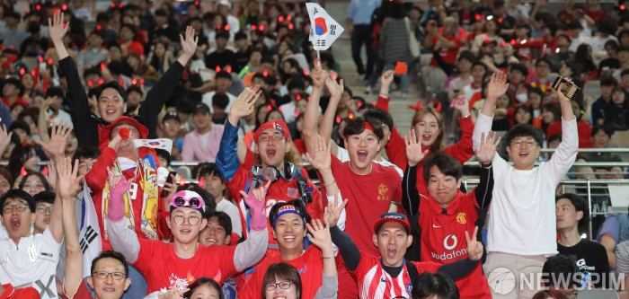 [서울=뉴스핌] 최상수 기자 = 16일 새벽 서울 마포구 서울월드컵 경기장에서 2019 FIFA U-20 월드컵 대한민국과 우크라이나의 결승전이 중계되는 가운데 축구팬들이 응원을 하고 있다. 2019.06.16 kilroy023@newspim.com